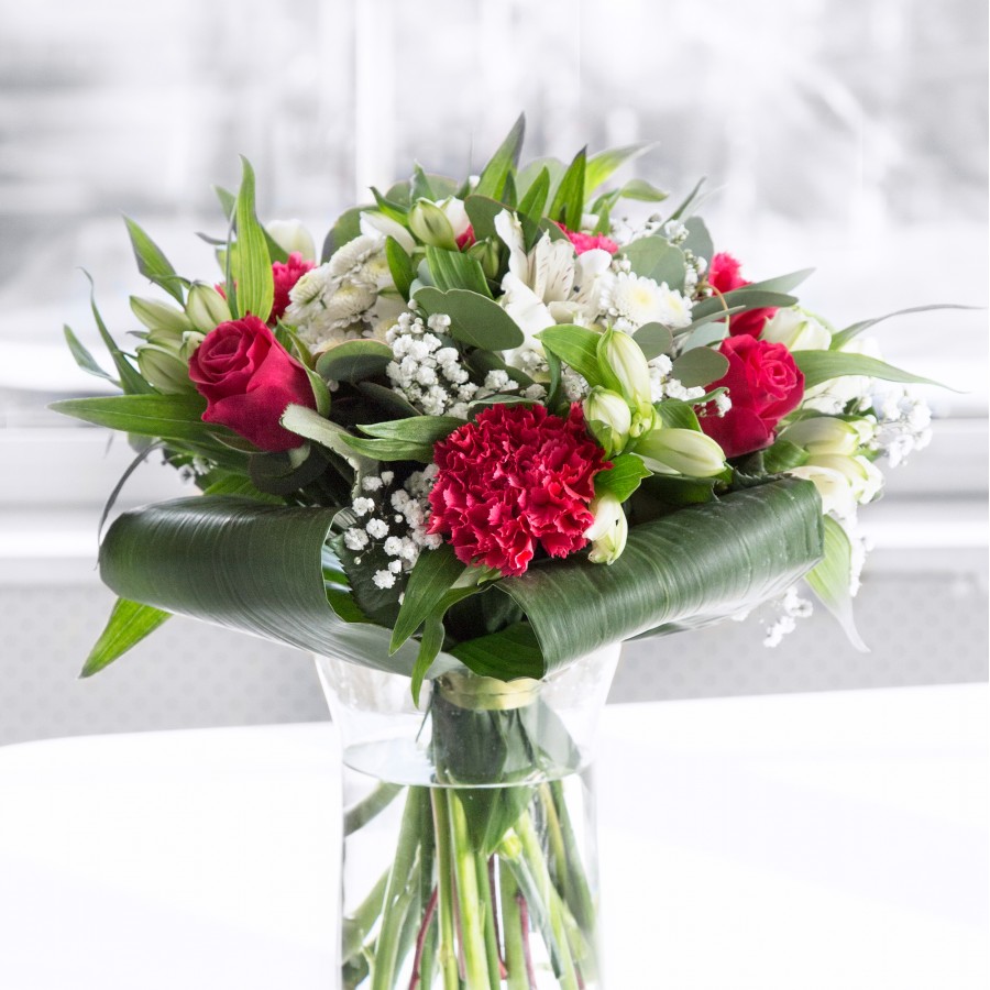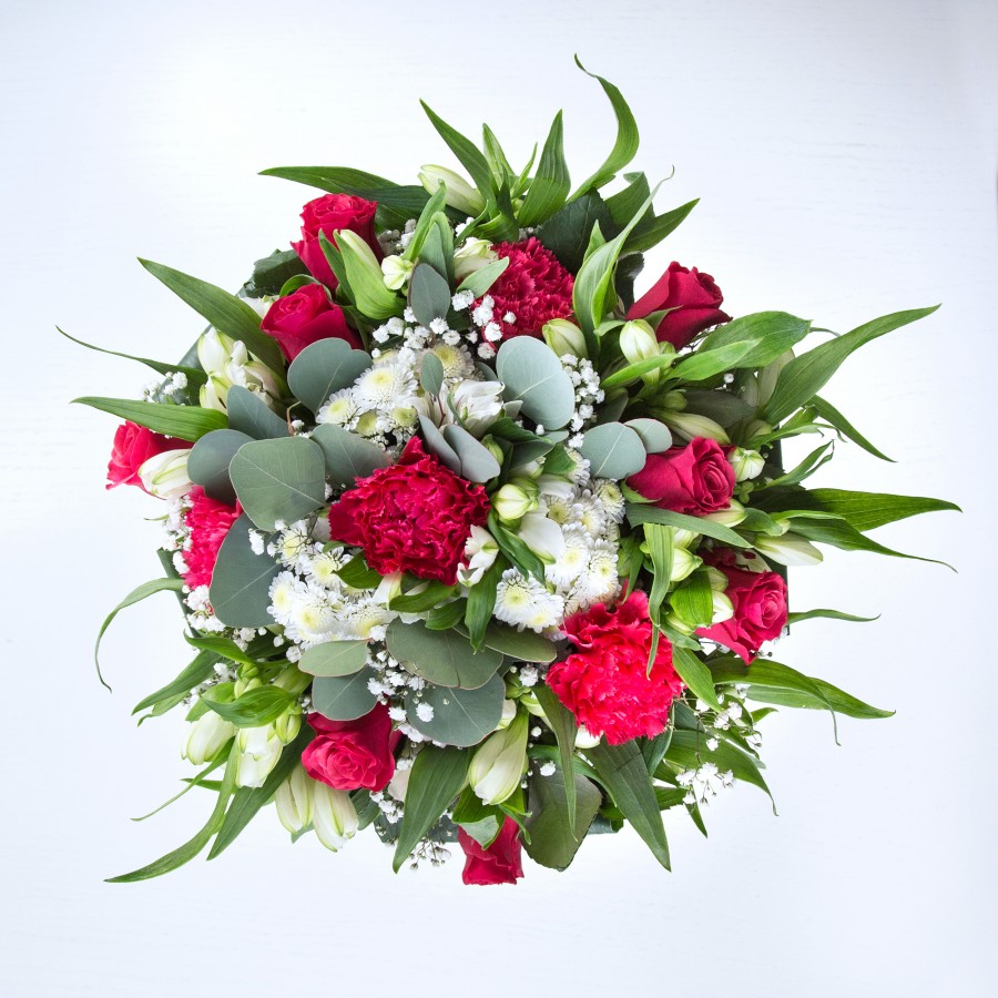 Embrace the elegance of our mixed bouquet featuring striking red roses paired with delicate white chrysanthemums. This unique arrangement is perfect for adding a touch of luxury to any occasion.